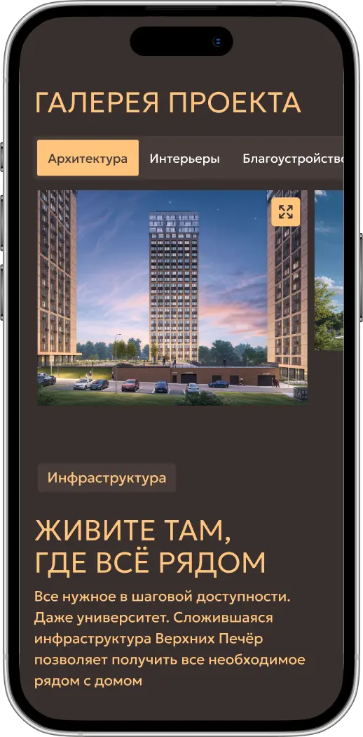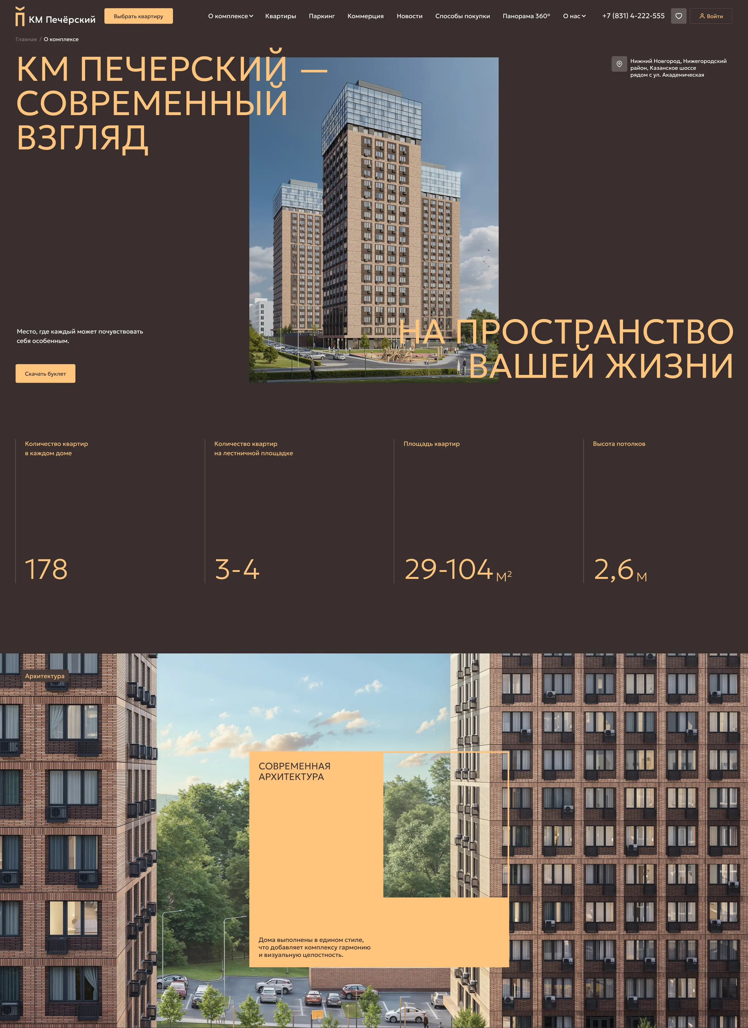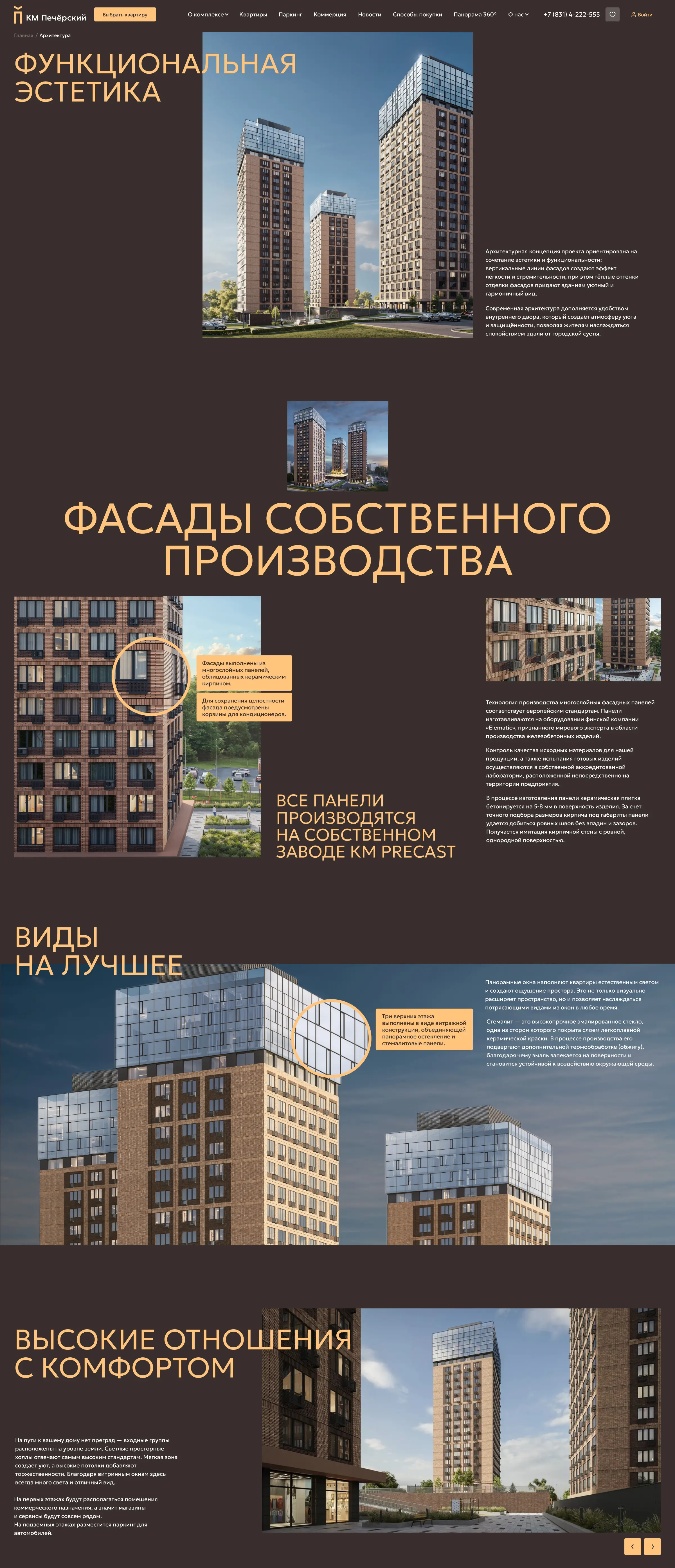 Главная страница рассказывает о преимуществах проекта, дает представление об архитектуре, инфраструктуре и отделке квартир, позволяет подобрать квартиру и машиноместо, а также получить консультацию менеджера.