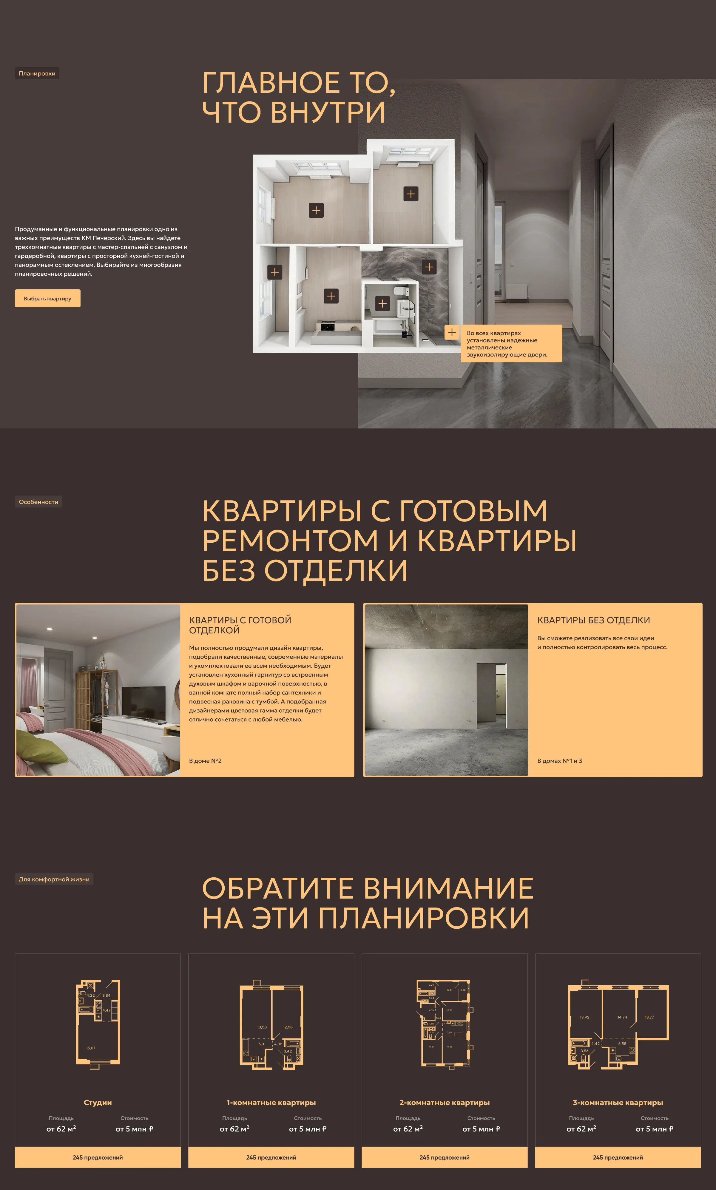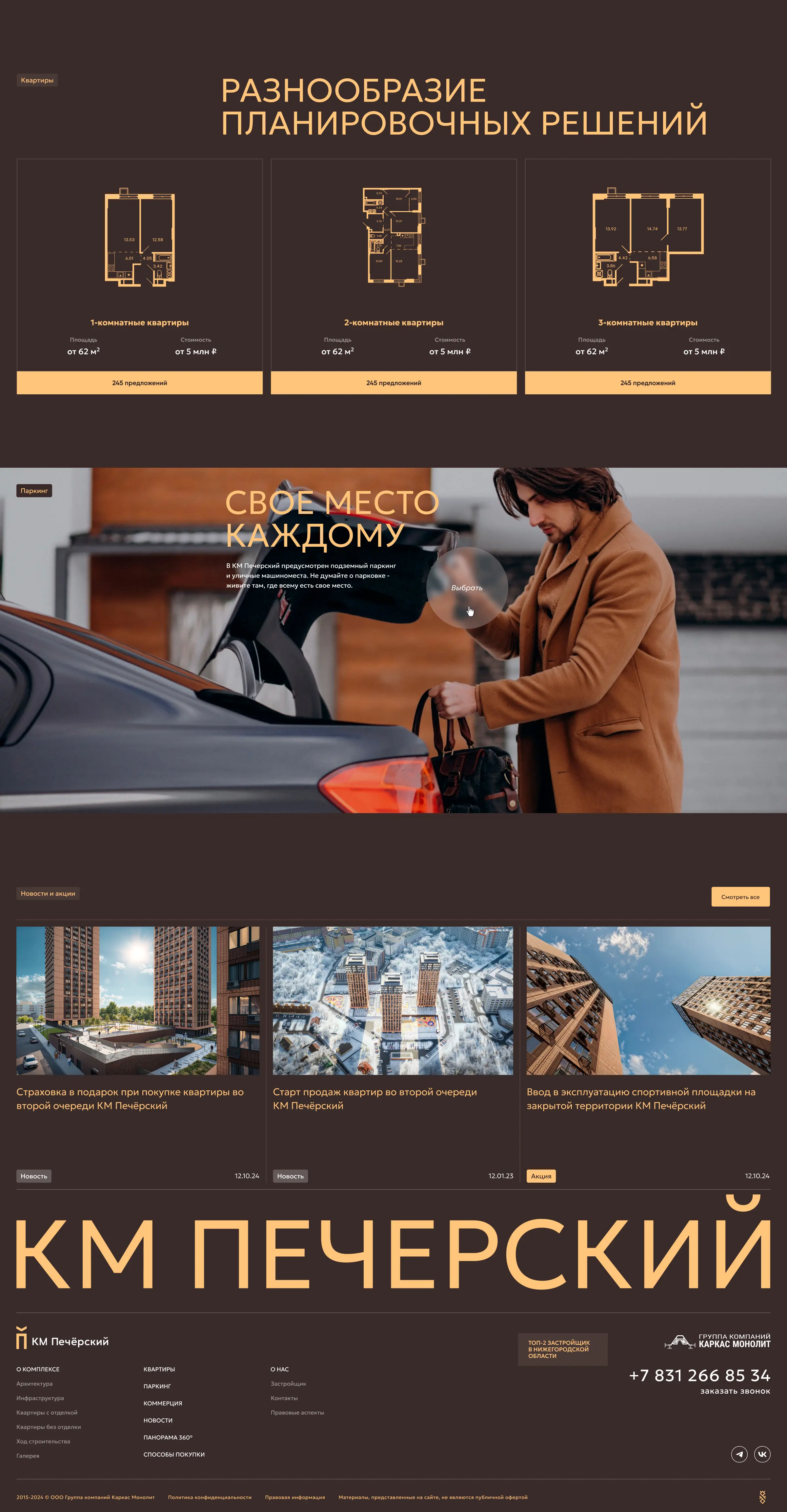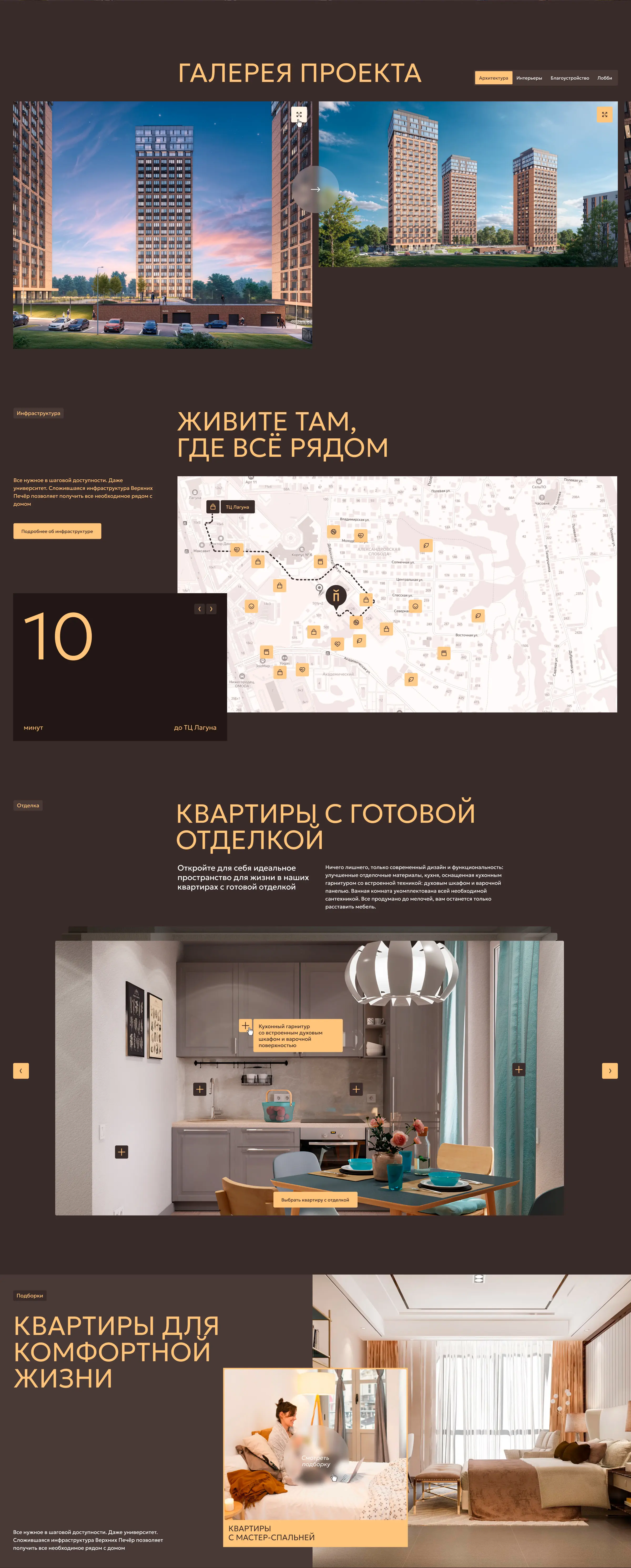 Главная страница рассказывает о преимуществах проекта, дает представление об архитектуре, инфраструктуре и отделке квартир, позволяет подобрать квартиру и машиноместо, а также получить консультацию менеджера.