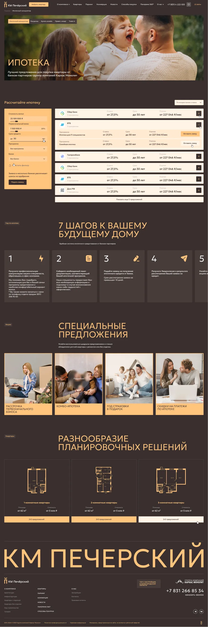Мы разработали дизайн сайта жилого комплекса «Печерский» для компании «Каркас Монолит». Сайт стал удобным инструментом для демонстрации уникальных особенностей комплекса: его архитектуры, планировок и социальных преимуществ. Кроме того, сайт позволяет упростить процесс обратной связи, предоставляя возможность записаться на просмотры, задать вопросы и получить актуальную информацию о наличии объектов.