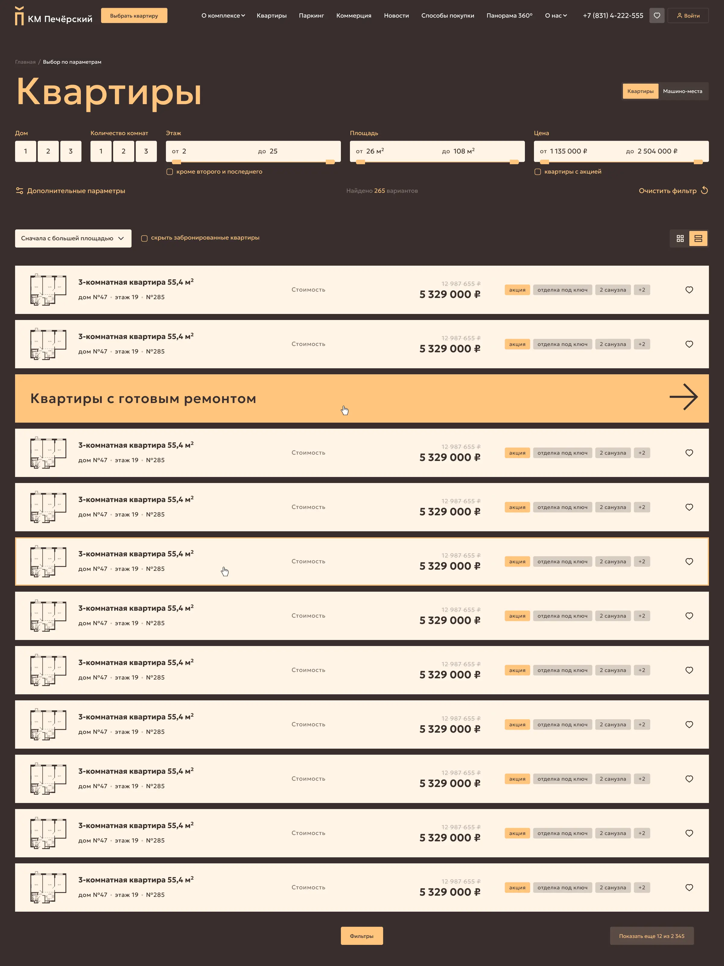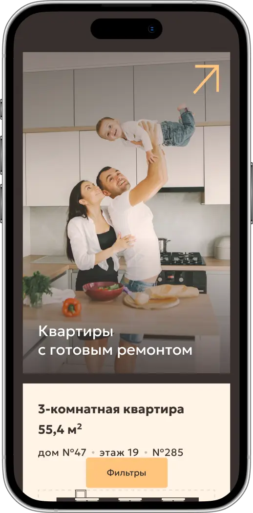 Параметрический выбор включает в себя поиск квартиры и машино-места. С учетом индивидуальных особенностей восприятия пользователей карточки недвижимости разработаны как в плиточном виде, так и в формате списка.