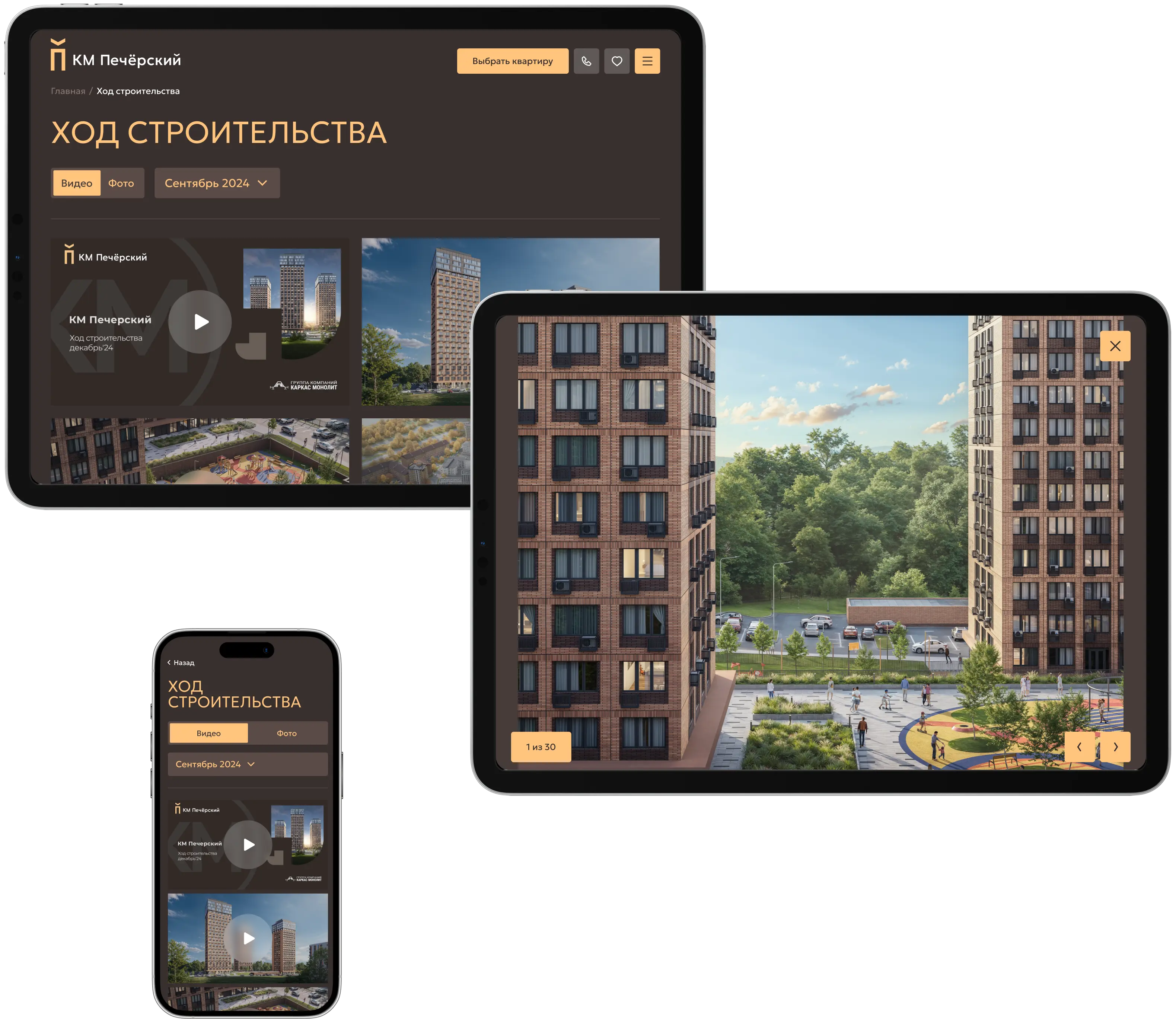 Страница «Ход строительства» позволяет отслеживать этапы возведения, демонстрируя регулярные обновления, фото и видеоотчеты,
